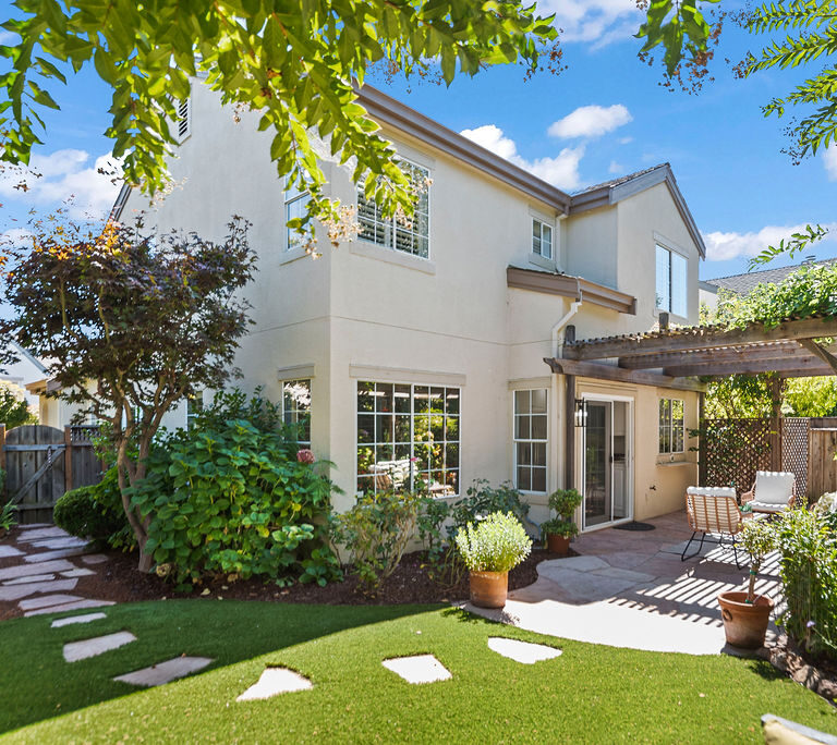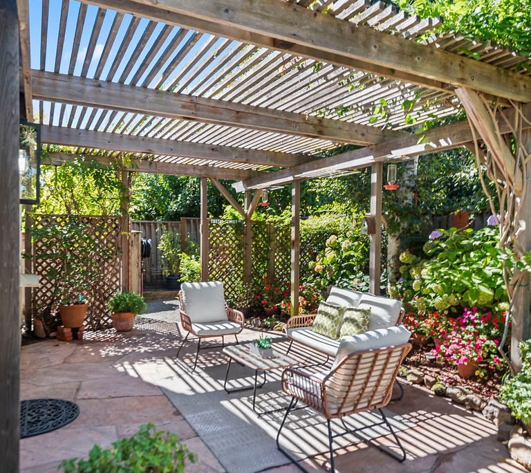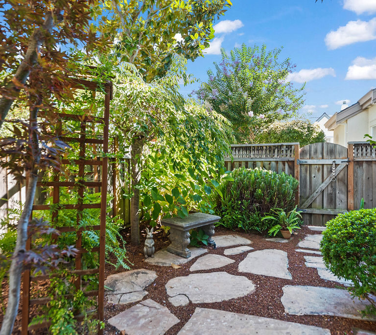 Highly-desirable corner lot creates a backyard retreat with classic arbor for shade, mature trees, stunning flora, babbling fountain, and stone pavers that lead to a secret-garden-style bench tucked into the greenery.