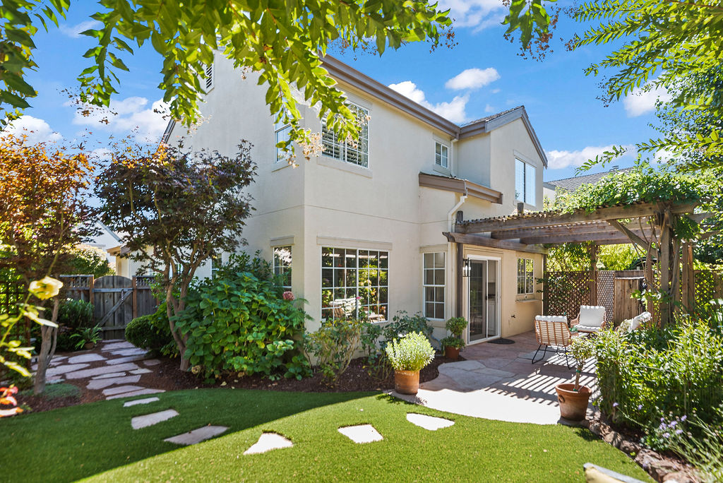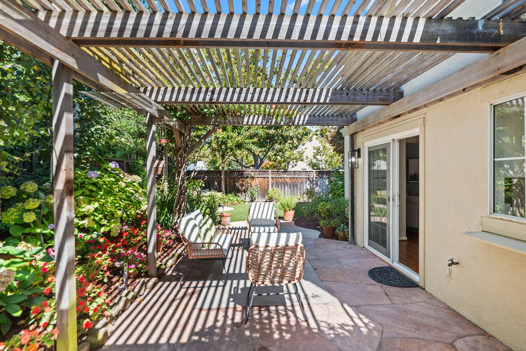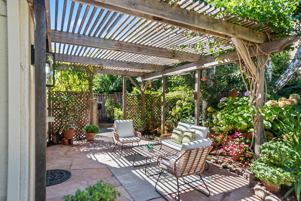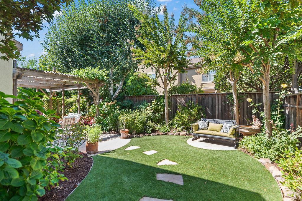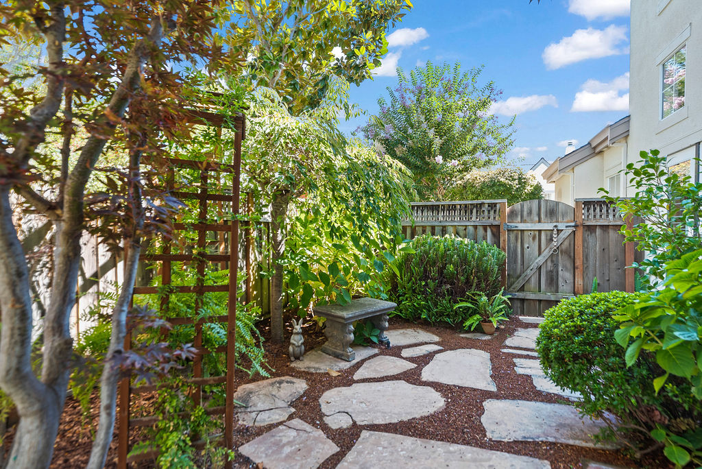 Highly-desirable corner lot creates a backyard retreat with classic arbor for shade, mature trees, stunning flora, babbling fountain, and stone pavers that lead to a secret-garden-style bench tucked into the greenery.